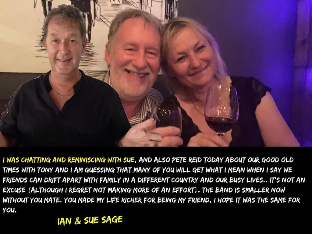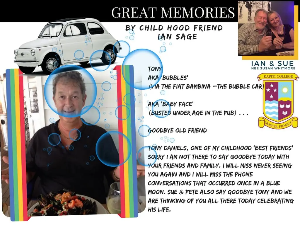 Tony Daniels… one of my childhood ‘best friends’ … sorry I am not there to say goodbye today with your friends and family… I will miss never seeing you again… and I will miss the phone conversations that occurred once in a blue moon…. Sue & Pete also say goodbye Tony and we are thinking of you all there today celebrating his life.